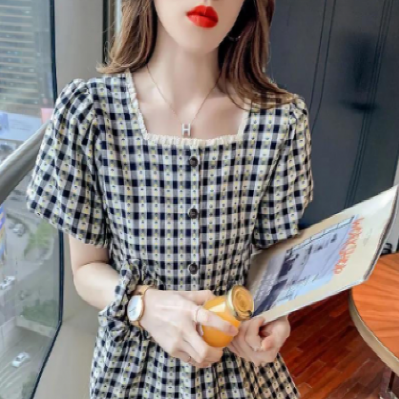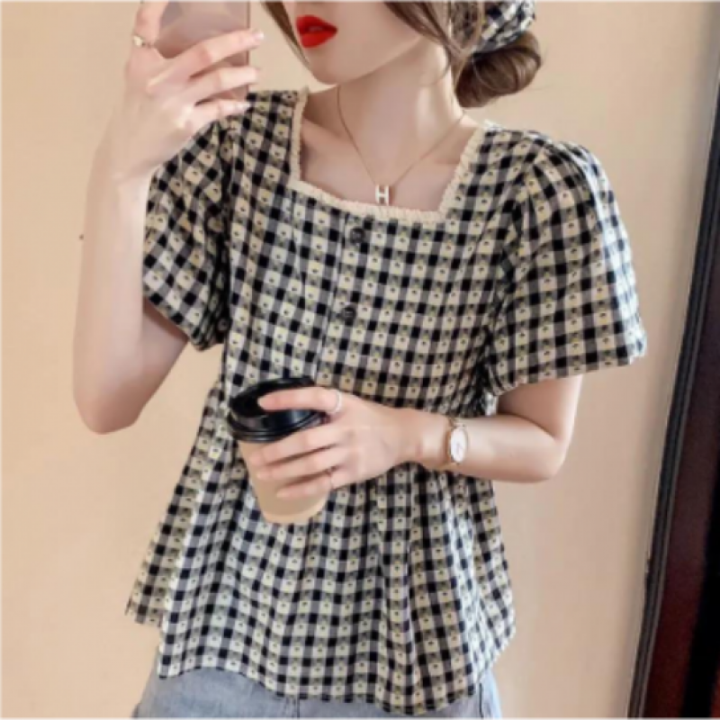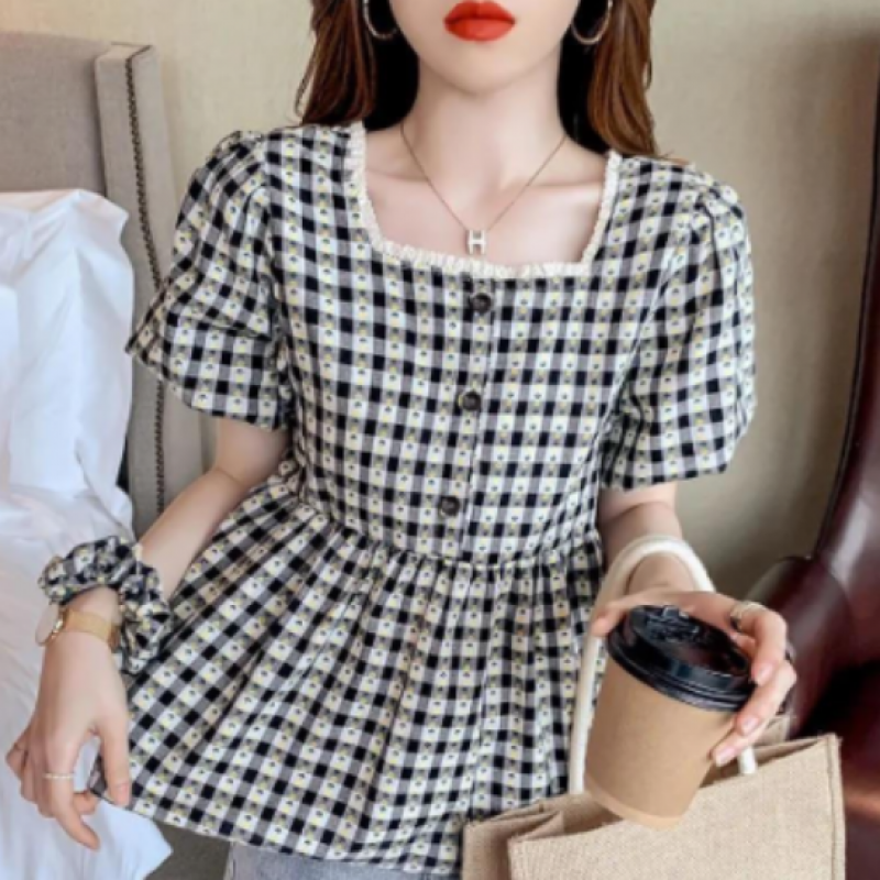 Puff Sleeve Ruffle Skirt Blouse Women Summer Chic Designer Plaid Puffy A Line Square Collar Kids Shirt (2pcs)